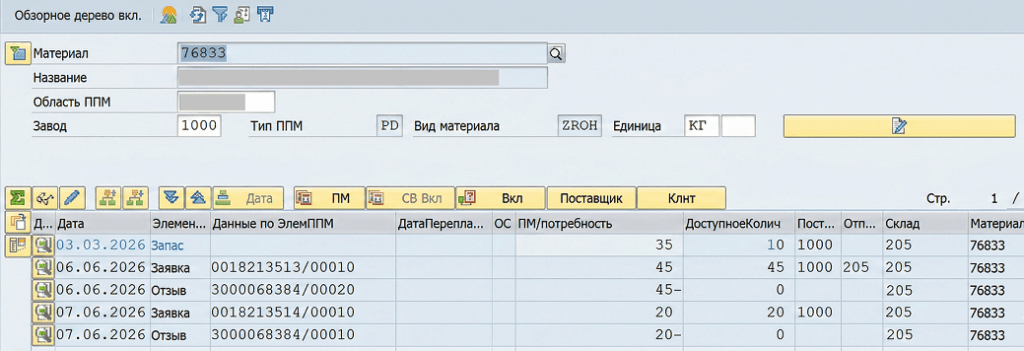 Однако, столкнулись с проблемой, что новый ППМ — MRP Live (транзакция MD01N) иногда не видит этого объединения и при обработке потребности на материал 76833, создает заявки без учета остатков материала 76834. При этом время от времени он работает нормально.