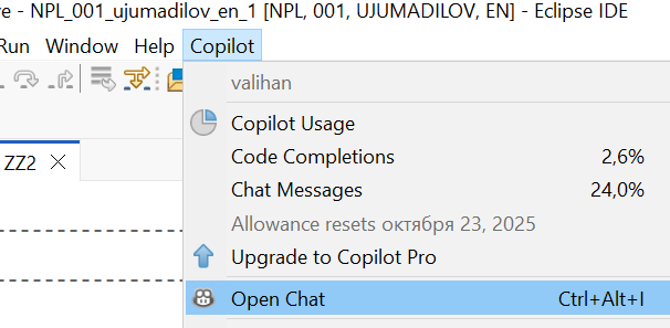 Решил начать с Copilot. Для этого с Eclipse Marketplace установил GitHub Copilot. Для этого в меню Help выбираем Eclipse Marketplace и в строке поиска ввел Copilot. На сегодня была доступна версия 0.11.0